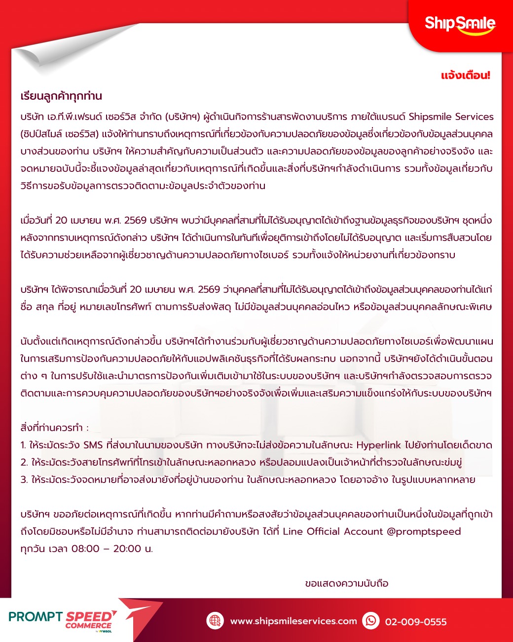 บริษัท พร้อม สปีด คอมเมิร์ซ จำกัด และบริษัทในกลุ่มตามรายชื่อที่ปรากฎในท้ายประกาศนี้ และอาจมีการปรับปรุงเป็นครั้งคราว ซึ่งต่อไปนี้จะเรียกว่า “บริษัท” ให้ความสำคัญกับการคุ้มครองข้อมูลส่วนบุคคล และการรักษาความปลอดภัยของข้อมูลส่วนบุคคลของลูกค้า บริษัทจึงได้จัดทำประกาศนโยบายความเป็นส่วนตัวฉบับนี้ เพื่อให้ลูกค้าทราบถึงแนวนโยบายเกี่ยวกับการเก็บรวบรวม ใช้ เปิดเผย โอนข้อมูลส่วนบุคคล รวมถึงสิทธิของเจ้าของข้อมูลหรือลูกค้า (“ท่าน”) ซึ่งบริษัทจะดำเนินการใดๆ ตามวัตถุประสงค์ของพระราชบัญญัติคุ้มครองข้อมูลส่วนบุคคล พ.ศ. 2562 (“พรบ. คุ้มครองข้อมูลส่วนบุคคล”) และ/หรือกฎหมายคุ้มครองข้อมูลส่วนบุคคลที่เกี่ยวข้อง
